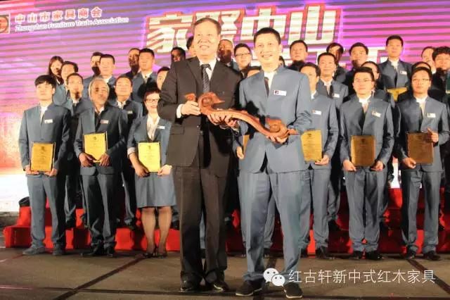 中國家具協會副理事長劉金良為中山市家具商會會長、紅古軒總經理吳赤宇先生授予神圣的權杖