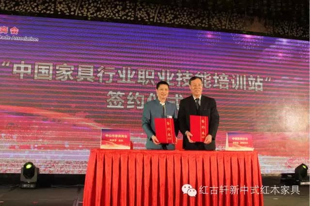 大會上,中山家具商會會長、紅古軒總經理吳赤宇先生并做了中山家具商會的“厘清定位、三名煥發(fā)”的戰(zhàn)略規(guī)劃;中國家具協會劉金良副理事長還與中山市家具商會吳赤宇會長共同簽署了“中國家具行業(yè)職業(yè)技能培訓站”協議,并舉行了授牌儀式。