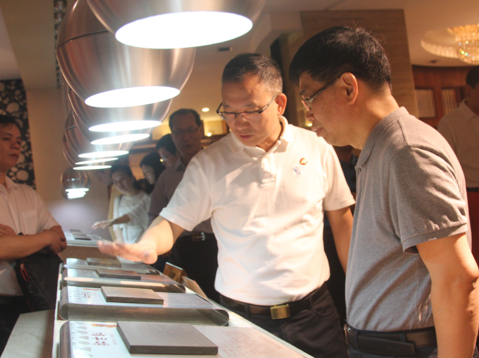 考察中,郭書(shū)記特以海南黃花梨及緬甸花梨書(shū)臺(tái)面板為例,為唐主席介紹大涌紅木家具的工藝水準(zhǔn)。