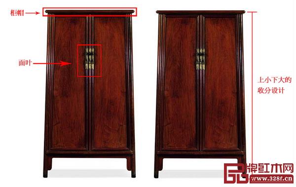 方角柜,基本造型與圓角柜相同,不同之處在于柜體垂直,上下同大,四條腿也是方材,柜門等采用合頁結(jié)合。