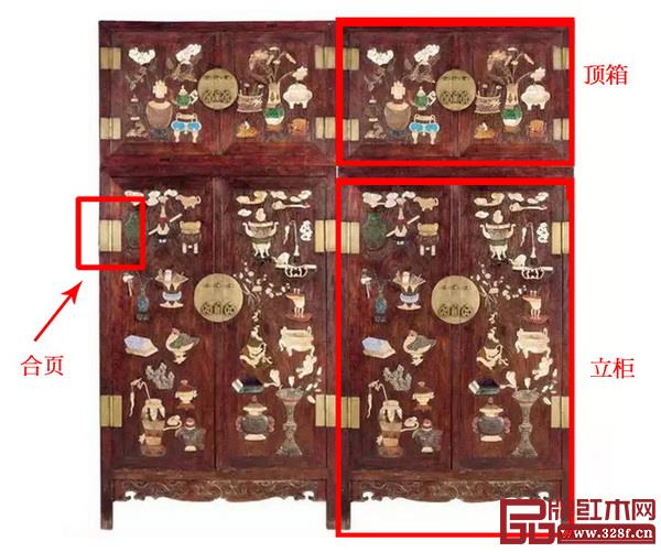 由于柜子一般成對組合,所以每對柜子立柜、頂箱各兩件,共計(jì)四件,叫“四件柜”。